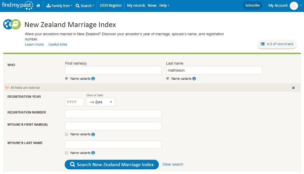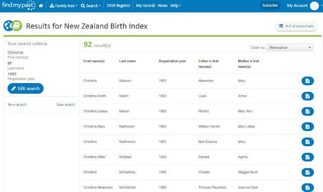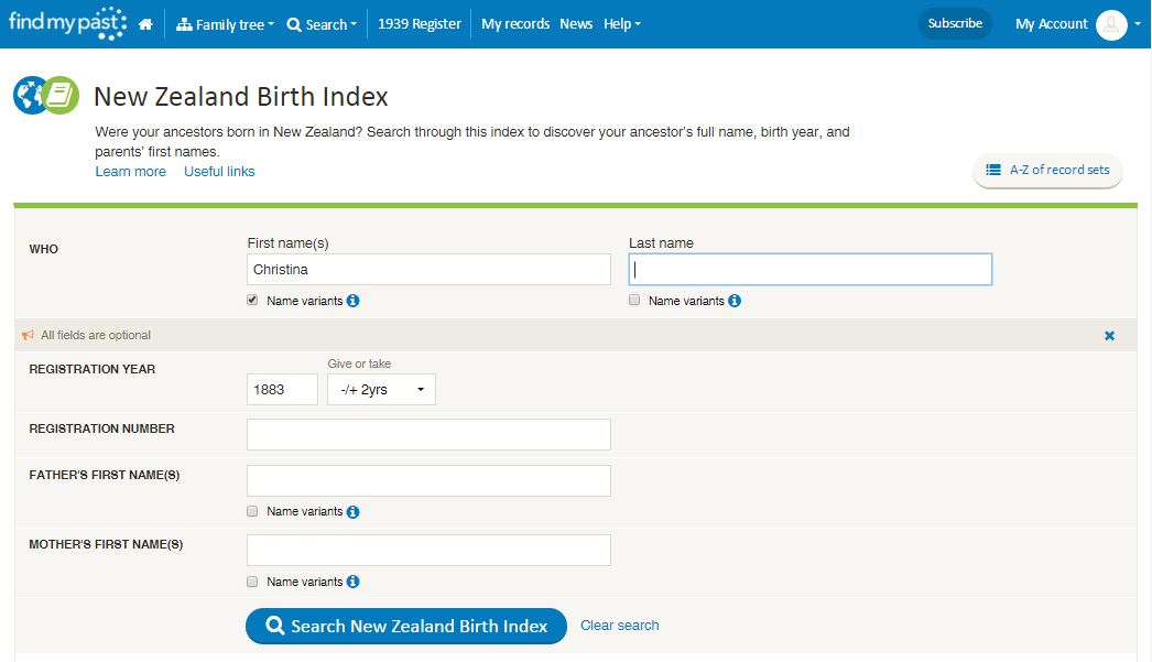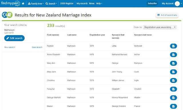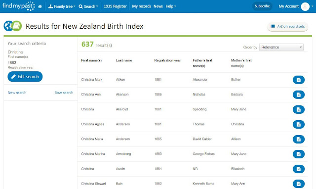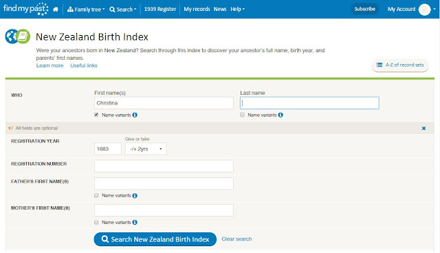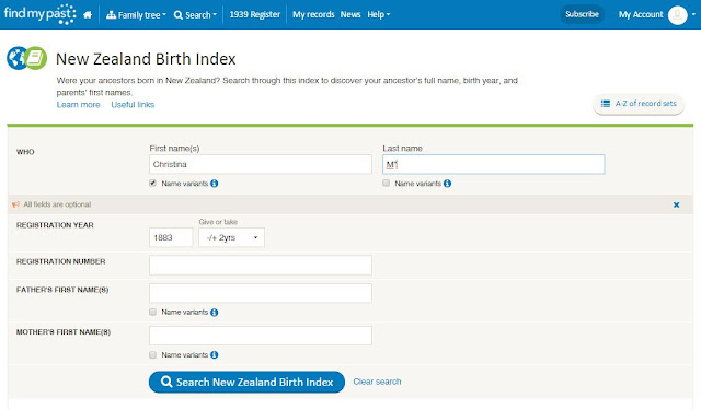 The data comes from New Zealand Birth, Death and Marriage Historical Records website (NZ BDM), but the benefit of it being on the Findmypast platform is the improved search facilities. So let's take a look at what you can now do.