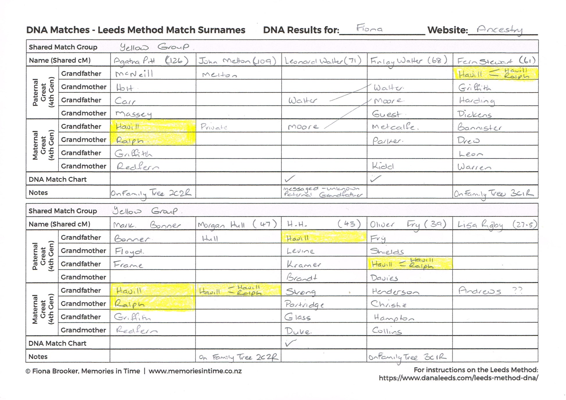 The DNA Matches - Leeds Method Worksheet comes in multiple sizes A4/Letter/Legal (20 matches) or A3/Ledger (50 matches). List your matches, Shared cM and if they have a tree, then the fun begins as you colour in your shared matches.